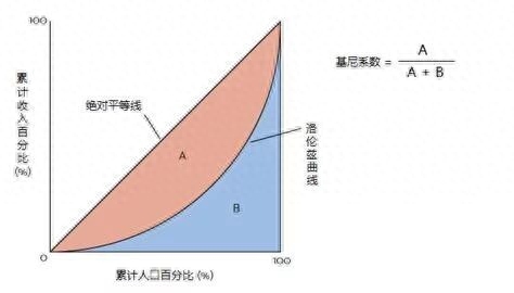 上图中,绝对平等线表示就是收入分配绝对平等,A区域越大,偏离绝对平等线越远,则基尼系数越大,社会分配越不公平。