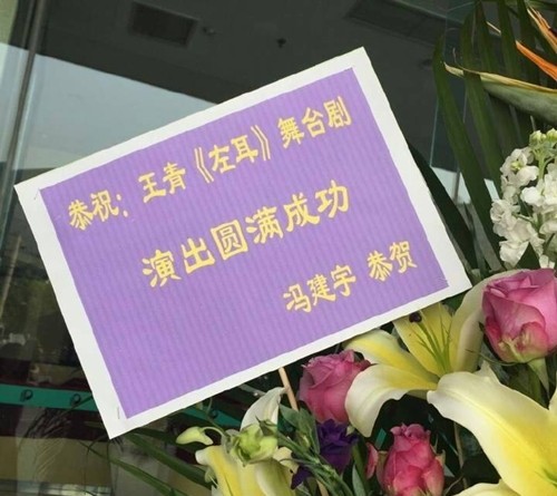 王青的第一次舞台剧,冯建宇送来了花篮,用纸是他喜欢的紫色。