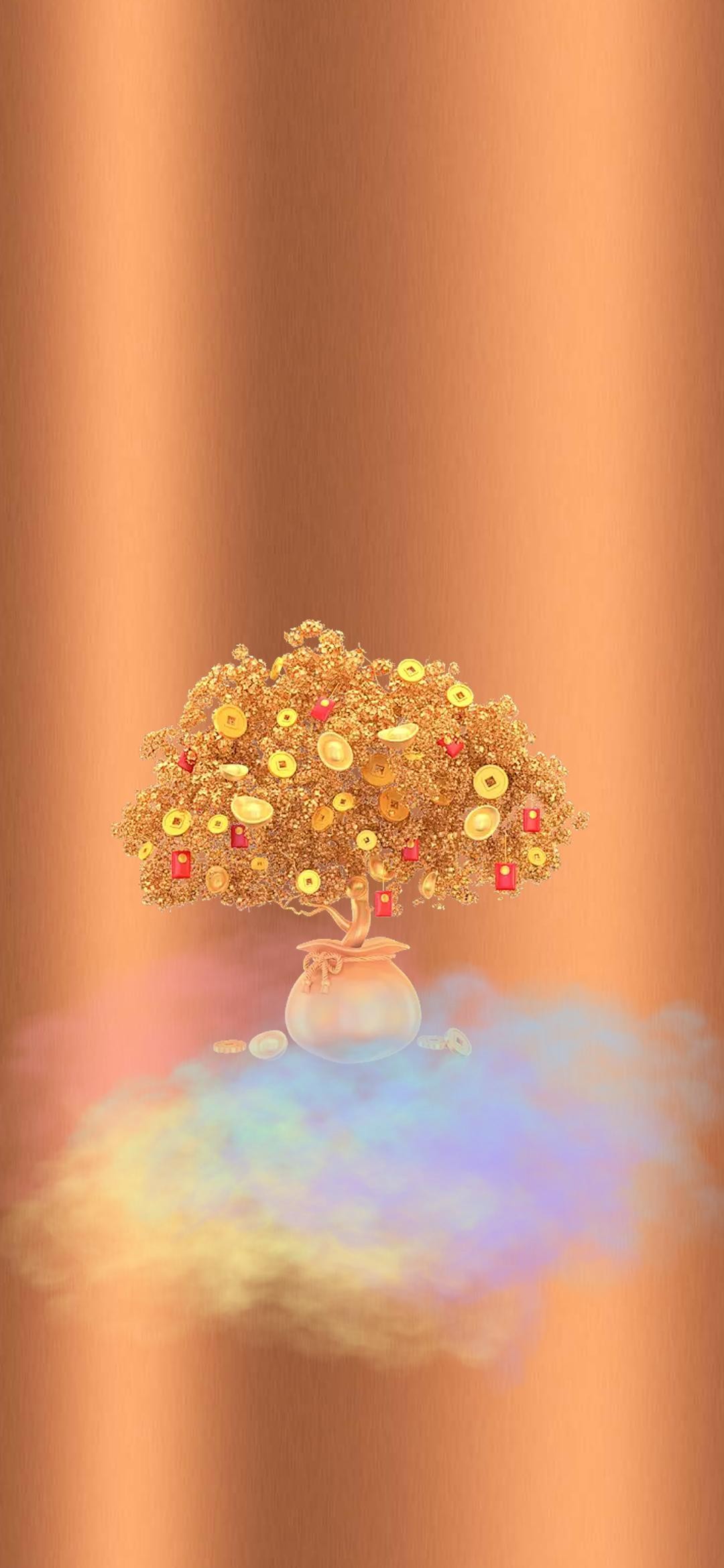 下面这张壁纸,福图一刻用2张图片拼接成背景,中间放置了聚宝盆和珠宝元素。