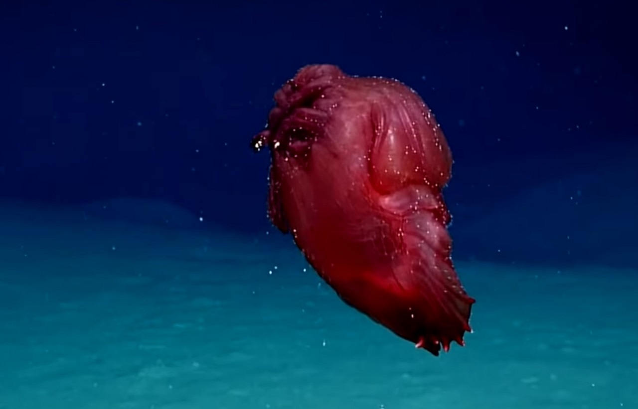 眼前这种生物长相十分奇特,它在海中游泳的姿势就像是一只没有头的鸡,因此一些地方经常将这种生物称为无头鸡海怪。实际上这是一种深海游泳海参,学名为梦海鼠。