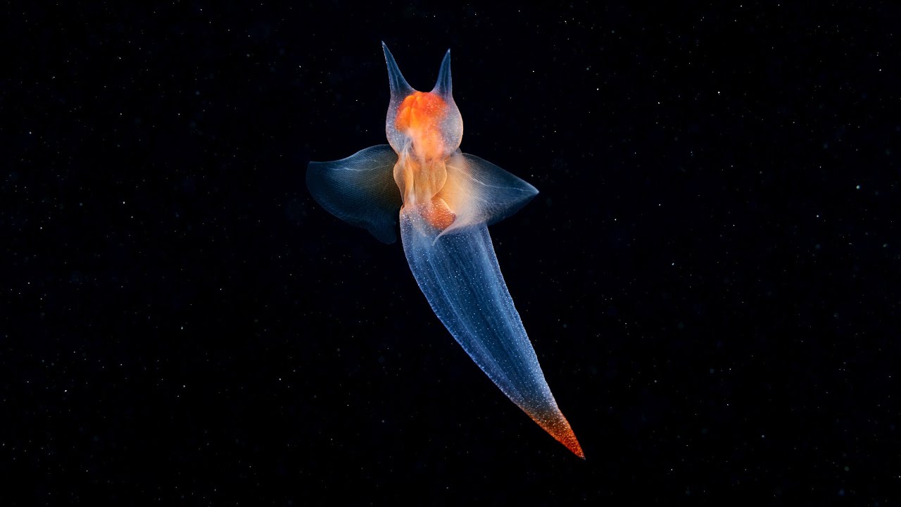 冰海天使的身长只有两公分到三公分,这种奇怪的生物浑身透明,身体中的红色部分是它们的消化器官,看起来就像一颗火热的心。