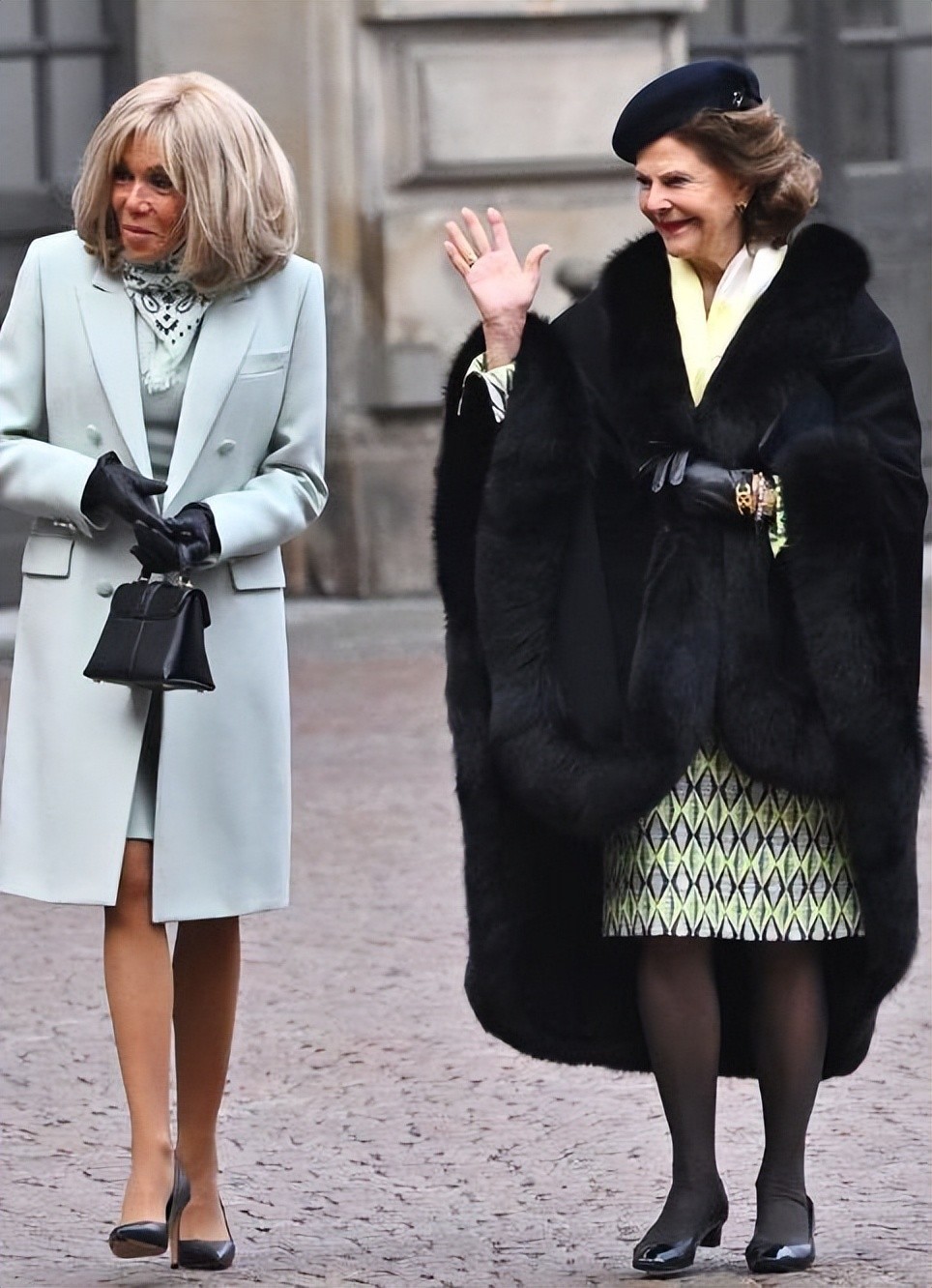 欢迎仪式选在斯德哥尔摩市中心皇家城堡的内院,马克龙跟瑞典国王一起检阅了皇家部队。布丽吉特跟王后紧随其后,两大美人同框,自然要被比较一番。