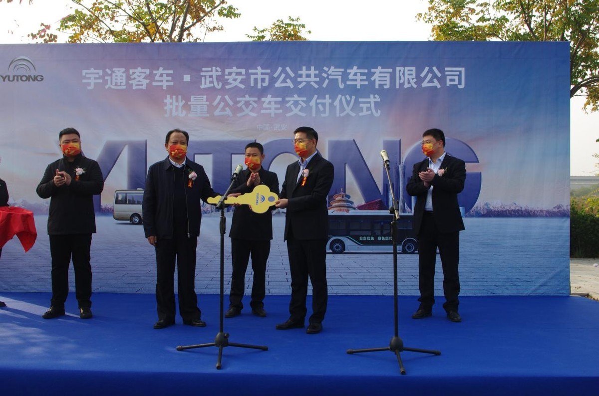 仪式上,李晓学向武安市公共汽车有限公司党支部书记、总经理刘保书交授车辆钥匙,寓意着将宇通新能源公交车成功交付。现场礼花绽放,掌声不断,50辆新能源纯电动公交车依次徐徐驶出,标志着市公交新能源进程又迈入一个新时代。
