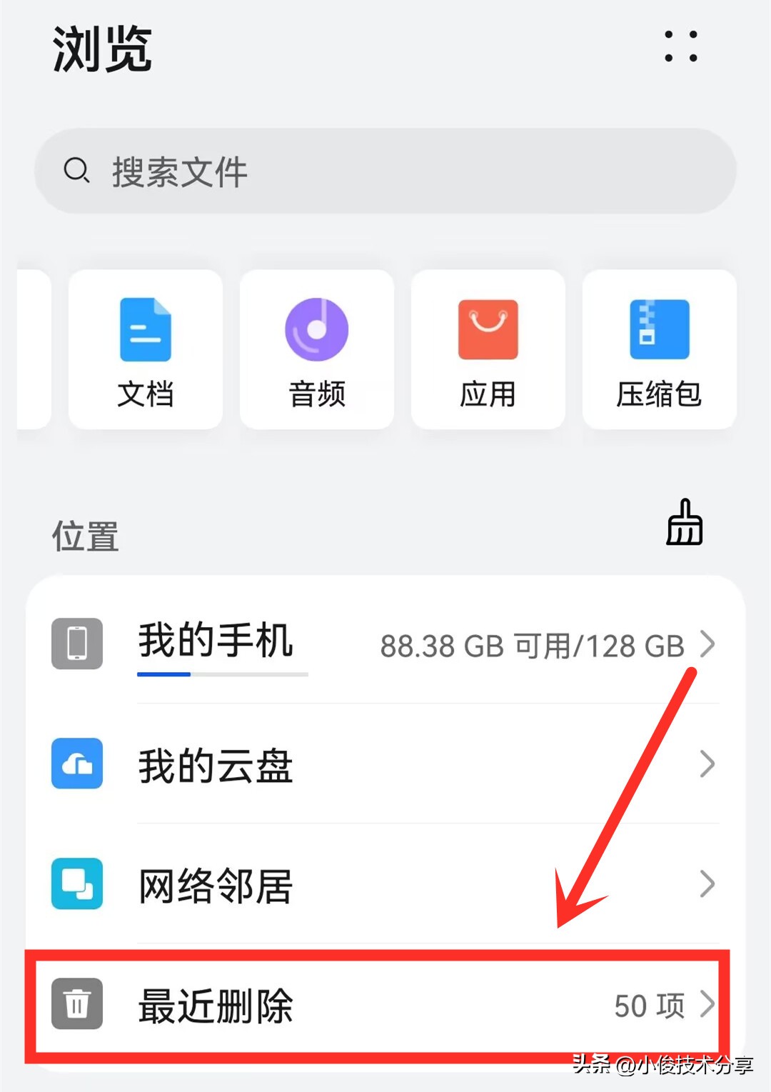 那么有些手机呢,这个回收站功能,隐藏在文件管理里面,我们此时打开文件管理,打开文件管理之后,在下面就可以看到一个最近删除,那么我们打开这个最近删除