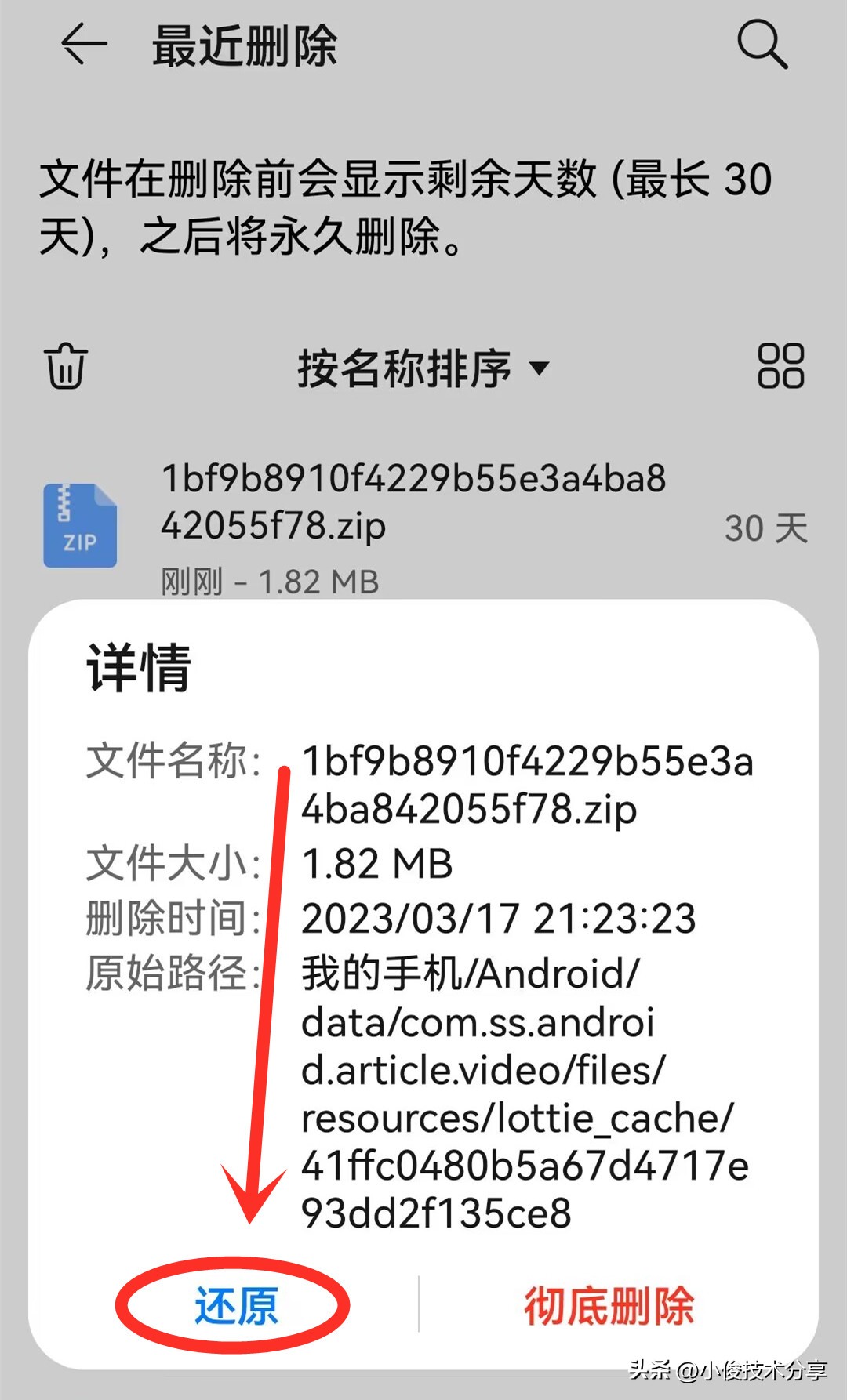 打开之后呢,我们会发现手机上面删除的文件也全部被保留在这里了,那么这些文件默认的保留时间呢,也是30天,在这个30天内,我们就可以把这些被删除的重要文件快速恢复回来,我们找到需要恢复的文件,点击一下,然后选择还原,这样就可以把这个文件快速找回来了!