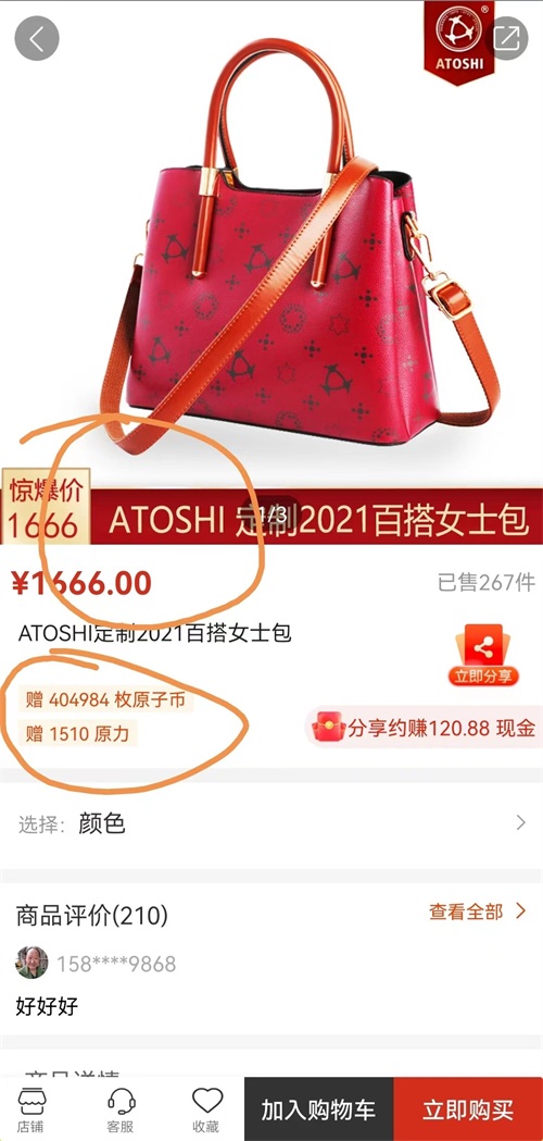 不同定价的商品均会绑定新相应数量的原子币,1666元手提包的市场价格仅为100多元,原子商城均以接近全返的形式上架,打着自营品牌的旗号来卖虚拟货币,大肆敛财。