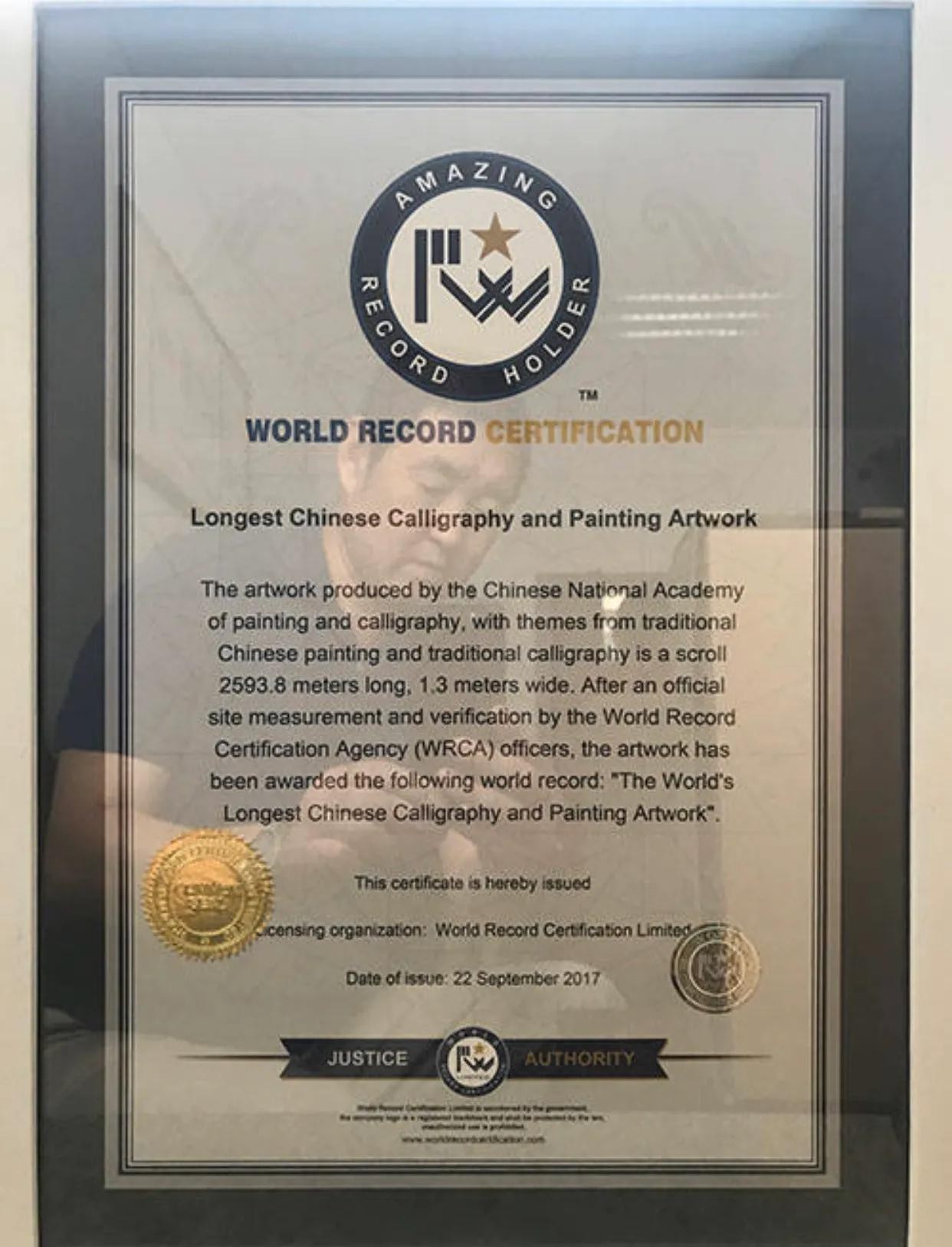 《中国书画世纪长卷》气势恢弘,笔墨丹青,一经徐徐展开,便令世人惊叹!很快,这幅传世之作便被世界纪录官方认证机构认证为:世界最长中国书画长卷(两千五百米世纪长卷),并在全国政协文史馆展出。
