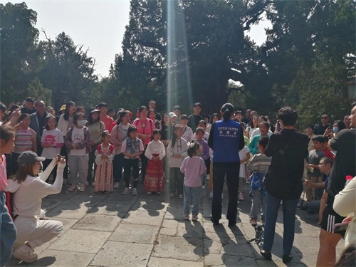 我们到了大成殿前,正好遇到一位志愿者(女)讲解员给游客们讲孔子孺家思想礼议,并带领大家向孔子行四拜礼。