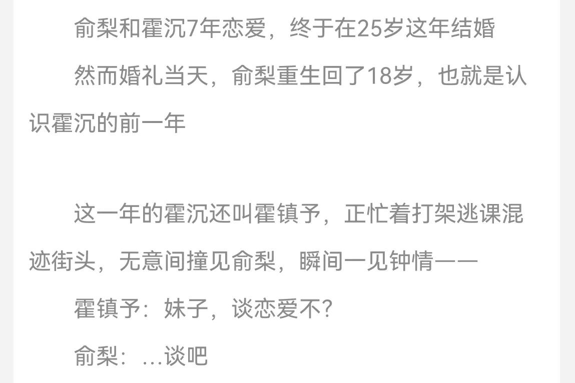 正当俞梨期待着和霍镇予好好谈恋爱,到了年龄走原来的轨迹结婚的时候,26岁的霍沉也来到了这个世界。