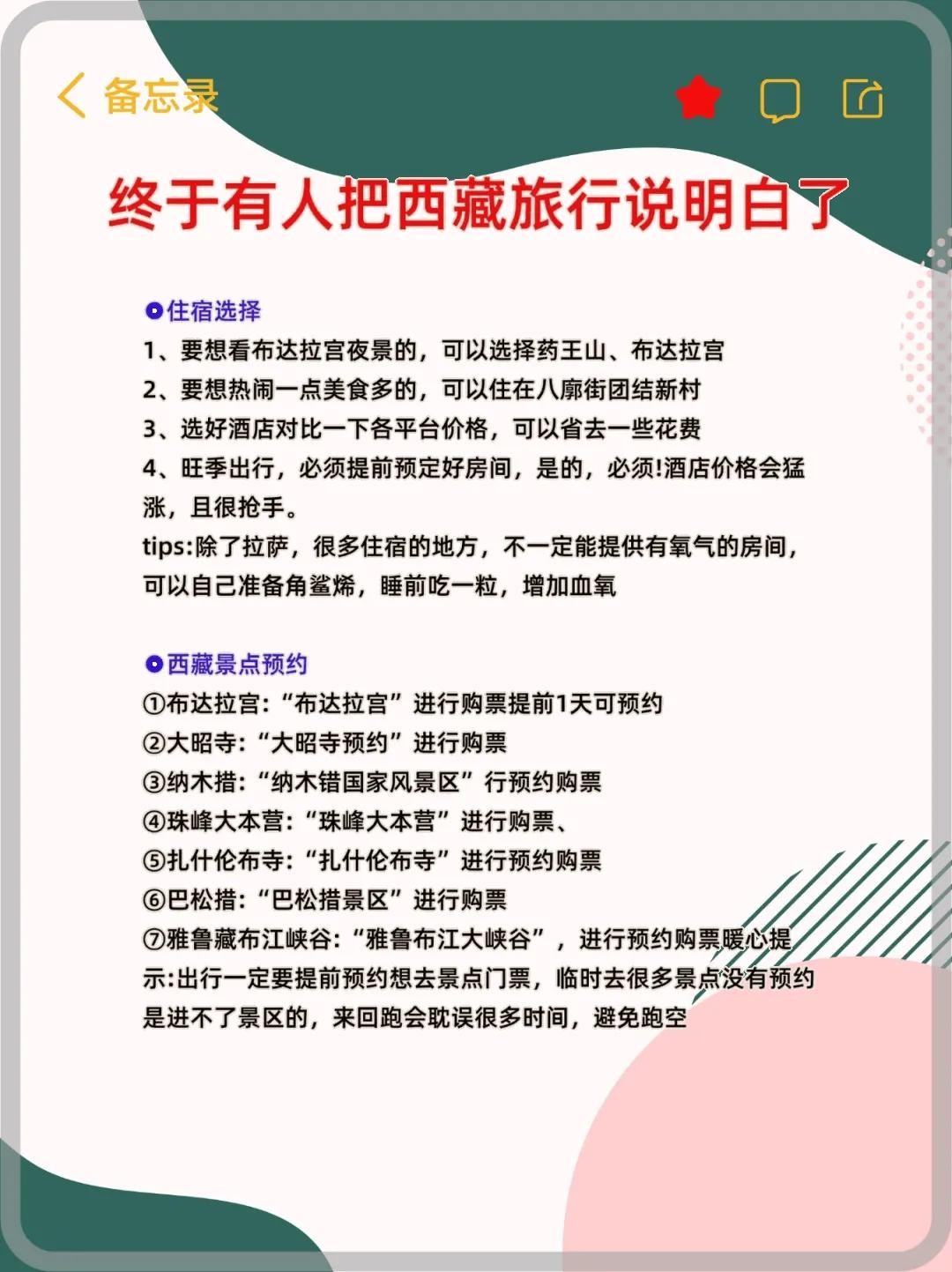 记得提前预约布达拉宫等重要景点的门票,临时去可能会扑空哦~希望这份攻略能帮助你玩转西藏!❤️