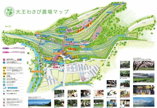 大王山葵农场的主要种植区分为北畑、东畑、大王畑、古畑和新畑。游客可参观游赏的景点主要集中在北畑和东畑区,随着地形平坦和水流分支增多,山葵种植面积逐渐增大,因此,山葵加工厂和体验工房分布在大王畑和古畑之间,这不仅有利于采摘、收割、烹制,还可让整个农场动静分开,延长游客观赏线路,增强体验性。