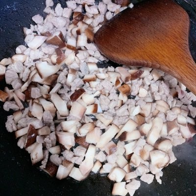 6、肉丁炒熟之后放入香菇丁,一起翻炒,3分钟的时间。