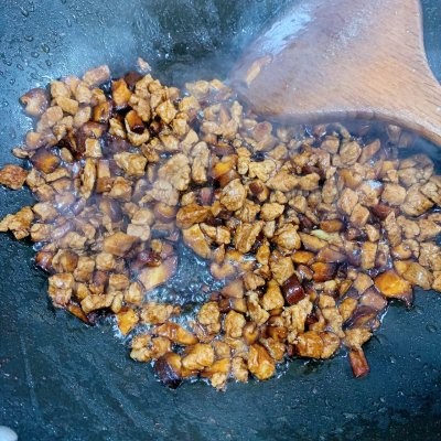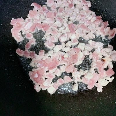 5、锅热后,放入少许油,把肉丁炒熟。