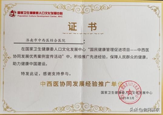 近日,济南市中西医结合医院凭借在中西医协同发展领域的卓越实践与创新成果,被国家卫生健康委人口文化发展中心授予“中西医协同发展经验推广单位”称号,充分体现了国家卫生健康委对济南市中西医结合医院一直以来深耕中西医融合、推动学科协同发展的高度认可,标志着医院在推动中西医协同高质量发展中迈出了关键一步!