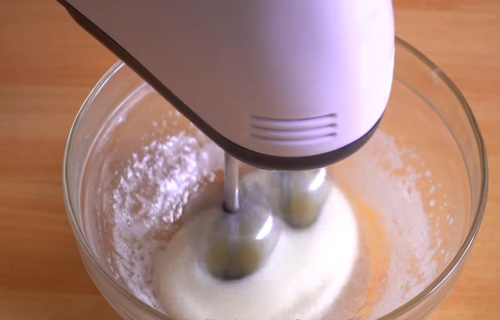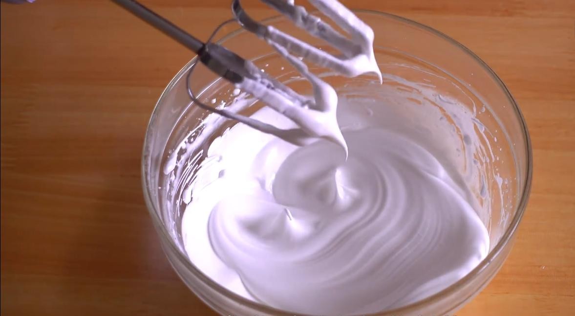 3.待白砂糖融化之后放置完全凉透,用电动打蛋器告诉开始打发,蛋清一定要打发到十分发才行,判断的标准就是拔起打蛋器之后,把玩倒扣保持5秒以上,蛋清都不会掉落下来;