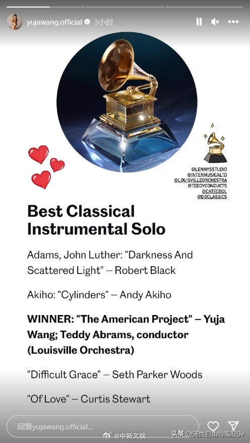 据悉,这是王羽佳第五次提名格莱美后,首次获奖。之前她分别于2009年、2011年、2018年和2019年获得过格莱美奖提名。这次终于圆了她的获奖梦想,也为中国音乐人赢得了荣耀。作为中国音乐界的杰出代表,王羽佳向世界展现了中国音乐人的实力和才华。