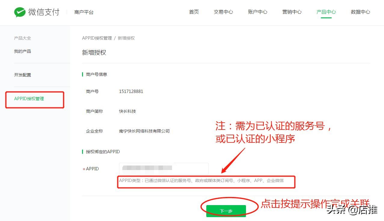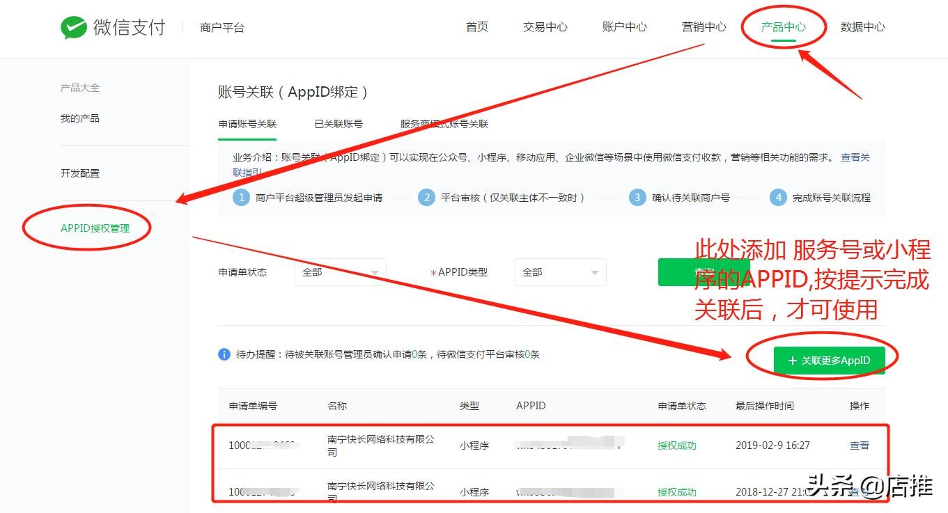 第三步、产品中心-APPID授权管理-关联:微信支付 与 公众号(或小程序),并且是同一营业执照主体