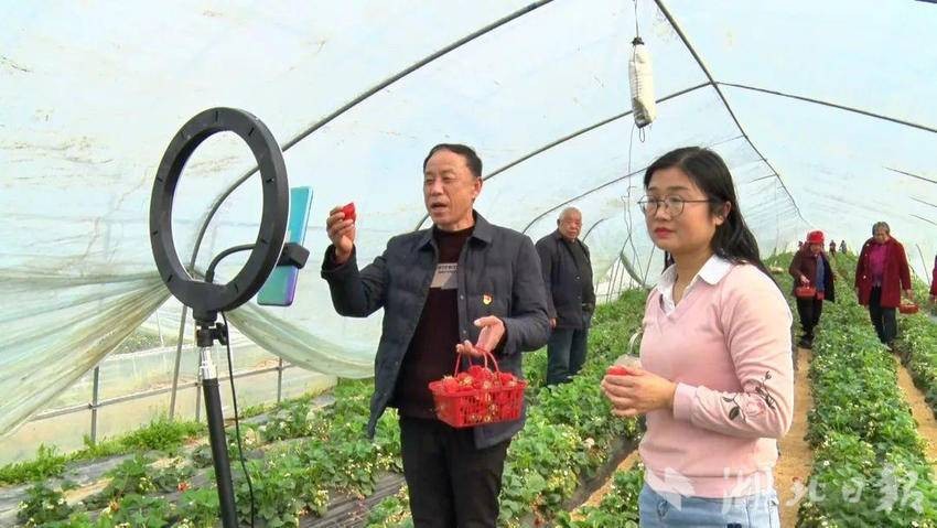 “直播间的朋友们大家好,这是我们广水市油榨桥村种植的富硒草莓,光照时间长、甜度高、汁水足、口感好,欢迎大家下单品尝。”“今天天气非常好,来我们油榨桥村草莓园采摘草莓的人非常多。”大棚内,与网友现场互动的带货主播不是别人,正是油榨桥村党支部书记尚贞猛和副书记胡艳玲。面对镜头,他们拿起草莓边品尝、边介绍,将草莓的口感、品质娓娓道来,让千里之外的网友跟随镜头直入大棚内部,如临其境。