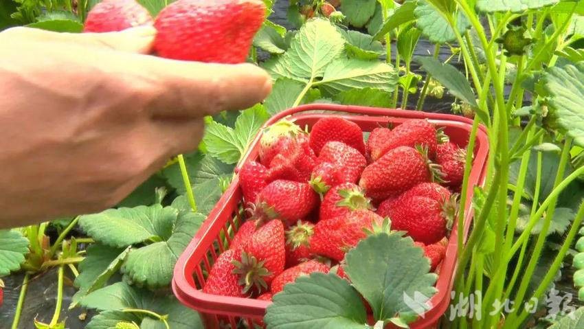 直播镜头前,一垄垄草莓长势喜人。青翠的叶片下点缀着朵朵白色小花,一颗颗鲜红的草莓垂缀其中,个大饱满、色泽诱人,香甜的气息扑面而来。