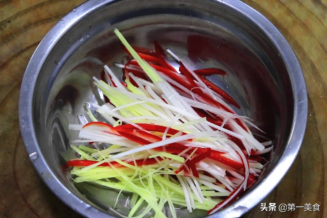 2.生姜一块,切成姜丝;大葱白一段,破开切成细丝;红椒一片,去籽后切成细丝,全部放在一起,用清水泡上。