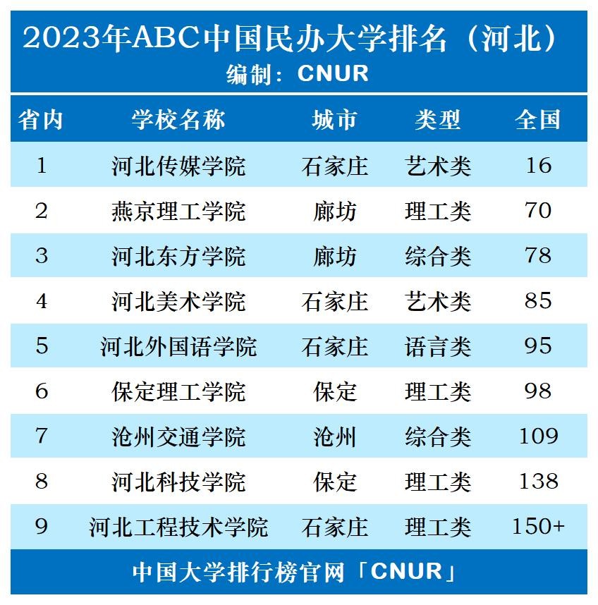 2023年河北省民办大学排名为:河北传媒学院排名全国第16、河北第1,燕京理工学院排名全国第70、河北第2,河北东方学院排名全国第78、河北第3,河北美术学院排名全国第85、河北第4,河北外国语学院排名全国第95、河北第5。