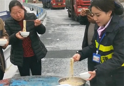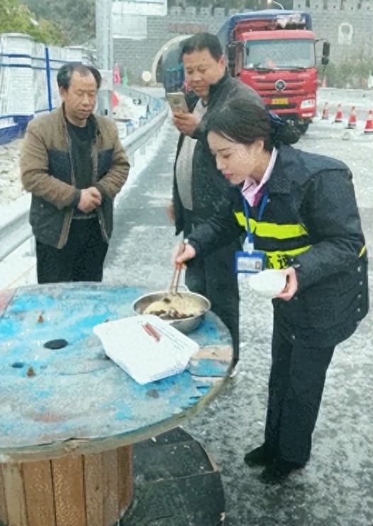 看到许多人被困在高速公路上无处可去,只能呆在车里挨饿受冻,刚工作一年的彭丽琴在收费站的厨房里煮了一大锅米粉,拿出小碗分给被困的司机们几份。