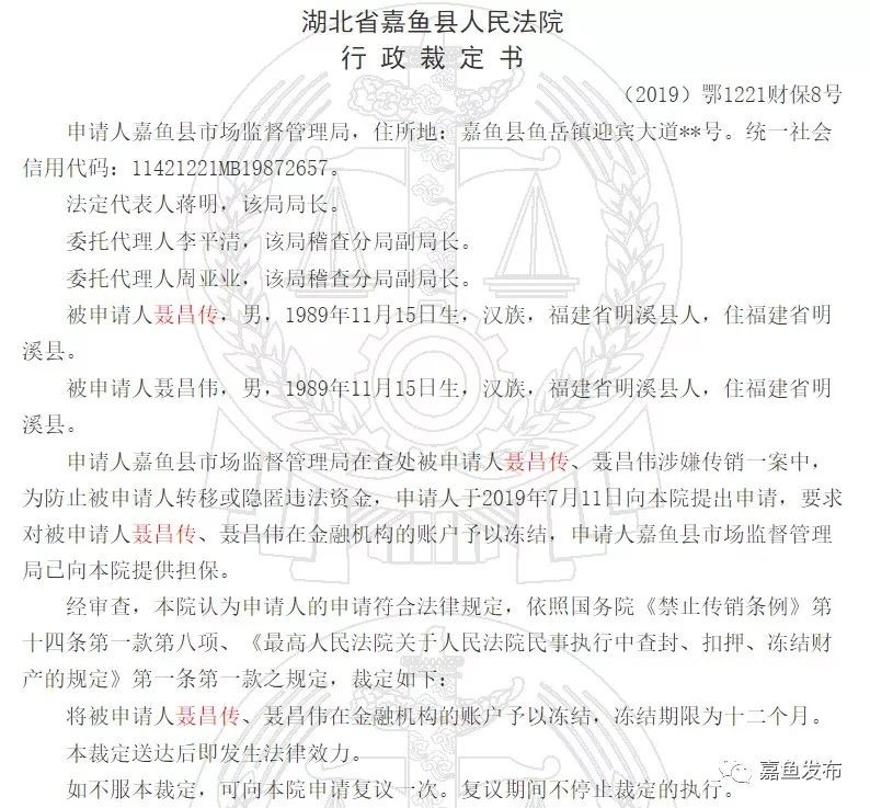 7月12日,嘉鱼县人民法院认为嘉鱼县市监局的申请符合法律规定,依照禁止传销条例等法律的规定,裁定将聂昌传、聂昌伟在金融机构的账户予以冻结,冻结期限为十二个月。
