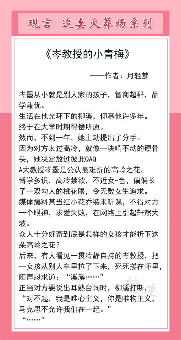 短评:女主温燃小妖精人设,热情小火焰,喜欢高岭之花男主沈砚之后,就勇敢追爱,结果惨遭拒绝。被拒后,女主潇洒离去,男主则开始空虚寂寞。这时轮到男主开始发疯追求,看着女主和异性亲昵相处,他醋意上头各种卑微各种心机,最终求爱成功抱得美人归。剧情酸酸甜甜,虽然是狗血的梗,但是读起来很美好,就小推吧!