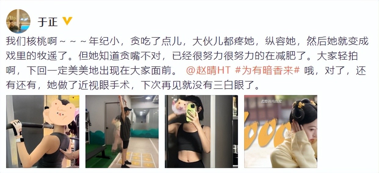 据了解,于正在个人社交媒体上发文表示:“我们核桃啊~~~年纪小,贪吃了点儿,大伙儿都疼她,纵容她,然后她就变成戏里的牧遥了。但她知道贪嘴不对,已经很努力很努力的在减肥了。大家轻拍啊,下回一定美美地出现在大家面前。哦,对了,还有还有,她做了近视眼手术,下次再见就没有三白眼了。”这段文字中,于正不仅回应了赵晴被指“照骗”的争议,还表达了对她的关心和支持。