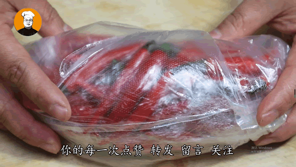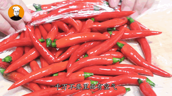 9、包好的小米辣再多包几层保鲜膜,一样包紧实,不要有空气。再放入保鲜袋中,同样把空气排出来,袋口系好,放入冰箱保鲜保存,吃一年都不会坏,要吃的时候随吃随取非常方便