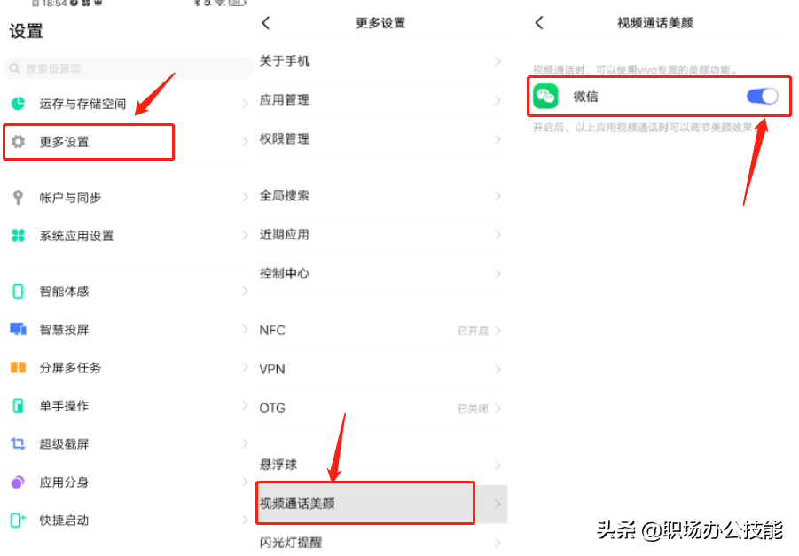 方法:点击【设置】,找到【更多设置】,再点击【视频美颜通话】,最后吧【微信】打开,就好了。