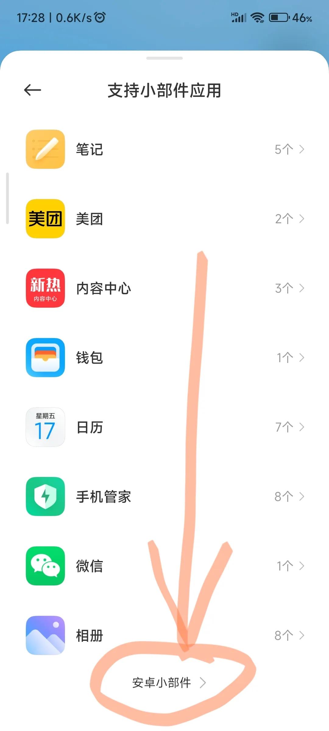 进入“支持小部件应用”的界面后再点击界面最下方的“安卓小部件”: