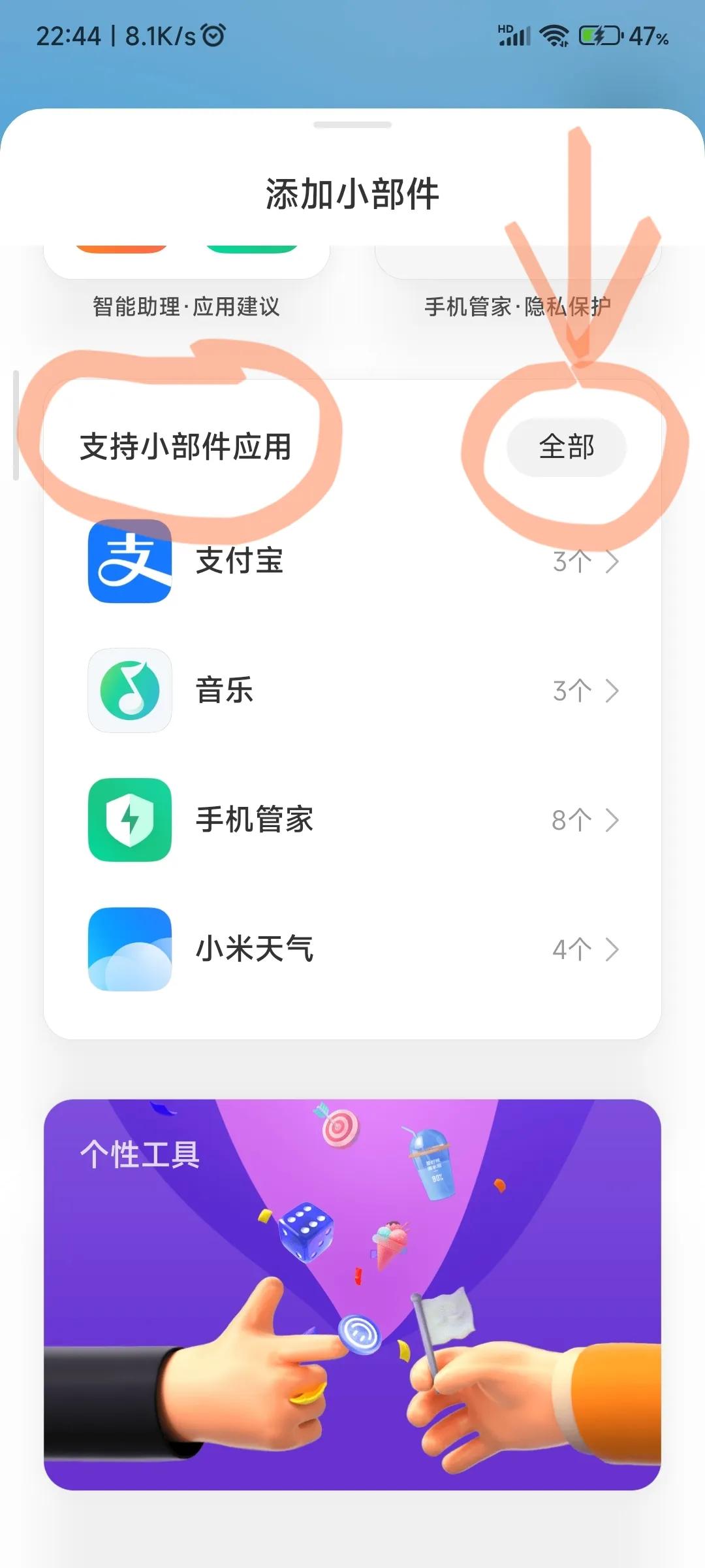 在“添加小部件”界面下往下拉,直到看到“支持小部件应用”,再点击右边的“全部”: