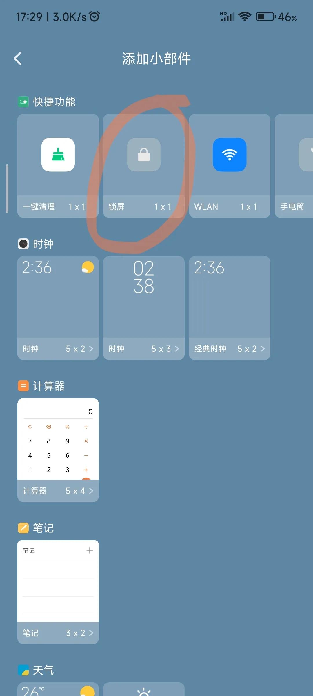 然后,出现“添加小部件”的界面,就看到“锁屏”了,点击它就可以将它放到手机桌面上了,再把它调整到自己想要的位置就可以了!