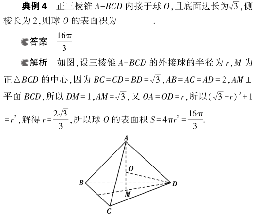 本题运用公式 R ^2=r^2+d^2 (r 为三棱锥底面外接圆的半径,R 为三棱锥外接球的半径,d 为球心到三棱锥底面中心的距离)求球的半径,该公式是求球的半径的常用公式.本题的思路是探求正棱锥外接球半径的通法,该方法的实质是通过寻找外接球的一个轴截面,把立体几何问题转化为平面几何问题来研究.