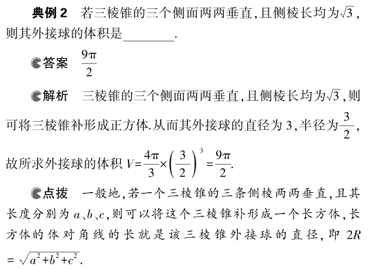 ②同一个顶点上的三条棱两两垂直的四面体、相对的棱相等的三棱锥,可将三棱锥补成长方体或正方体;