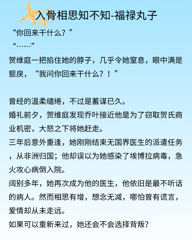 多年后,乔叶再次成为贺维庭的医生,两人都未曾忘记对方,也不曾想要去忘记,属于比较古早的虐恋故事。