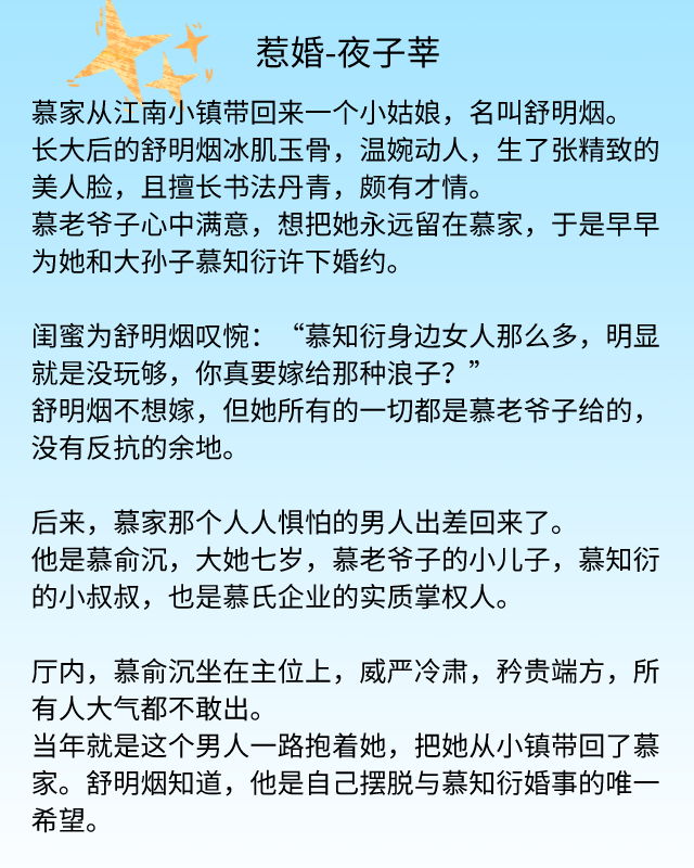 慕俞沉是家里真正当家做主有实权的人物。舒明烟很早家里人就没了,被慕家爷爷带回家养大,更被与慕家长孙定下婚约,但这个长孙是个花心大萝卜。
