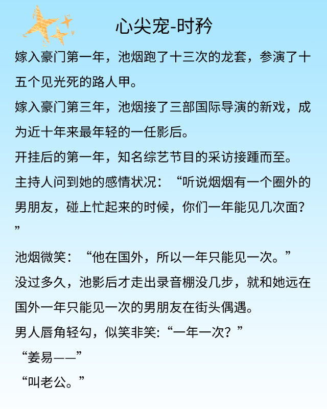 整篇故事是小甜文,基本无虐。姜易与池烟结婚属于先斩后奏,他的父亲一直不喜欢池烟,但姜易的母亲还是很喜欢的。