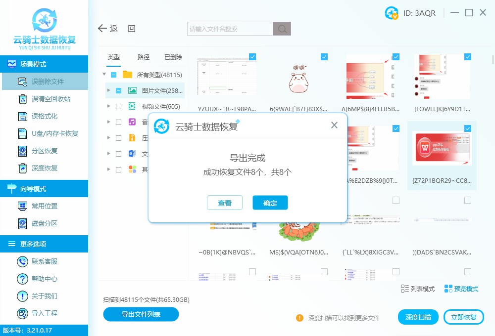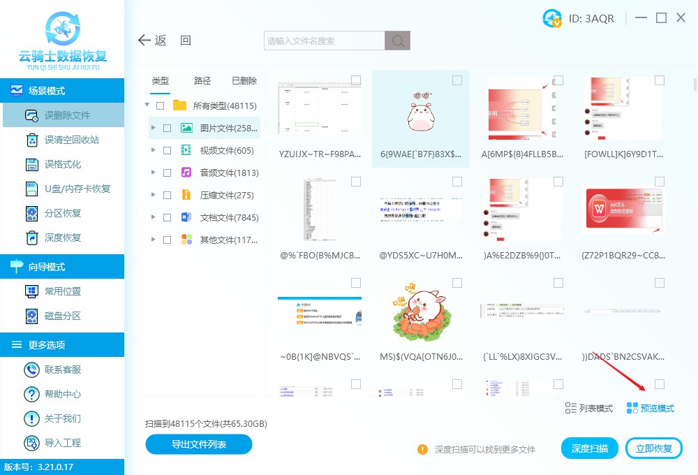 数据扫描好后,点击预览模式查看是否有自己需要的图片(具体预览方法可以参考:预览文件教程),选择要恢复的文件,选好点击立即恢复。
