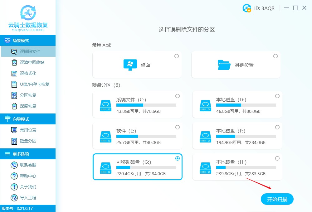 到官网下载云骑士数据恢复软件,进入软件界面后,可以看到有场景模式和向导模式,根据需要选择恢复模式,这里以场景模式下的误删除文件为例。