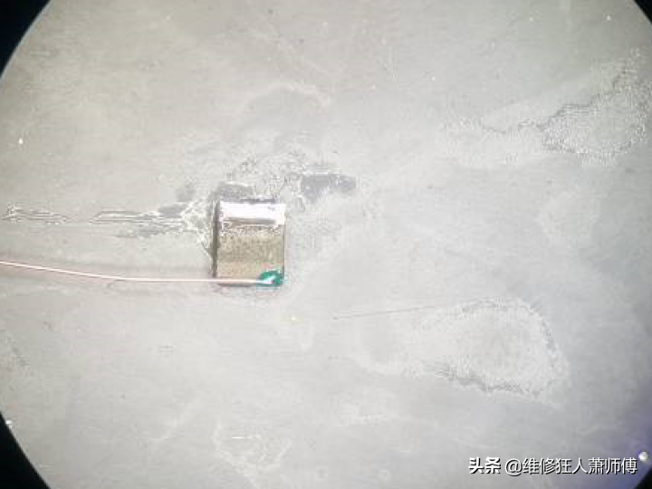 这个电感太薄,以前的苹果系列电感都不能用,所以只能修了。这种电感万用表的通断档就能测出来好坏,一测,好的,那就修脚吧,接了根线,补上绿油,绕圈。