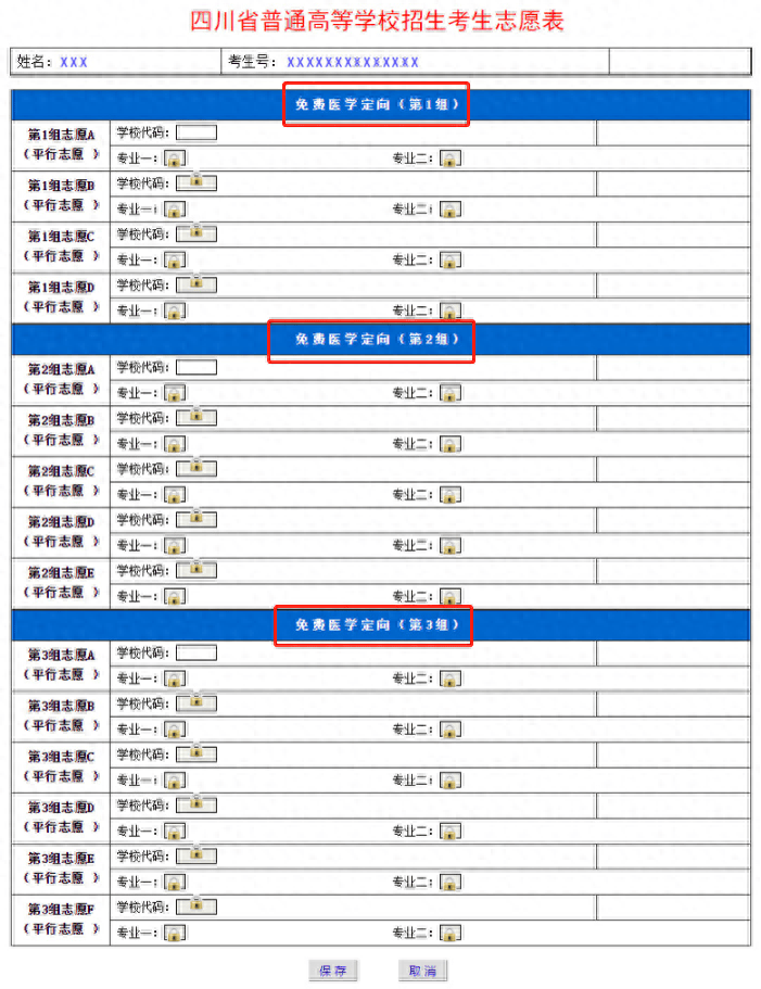 在本科提前批填报的免费医学定向本科志愿,与其他类型不同的是,分为三组来填!这三组所填报的考生不同,志愿数量也不同!而且免费医学定向本科没有“定向调配”的选项,分数不够就会滑档!
