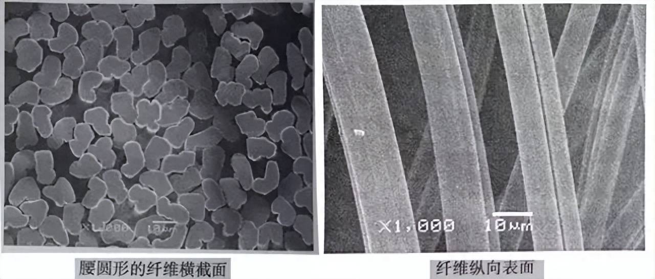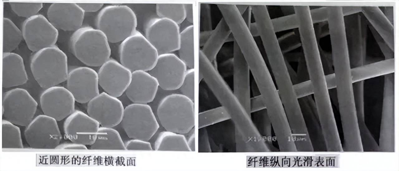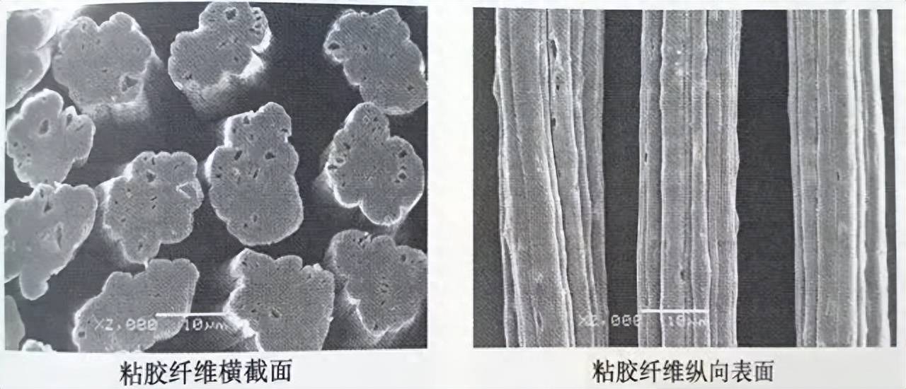 普通粘胶纤维复杂成型过程的不均匀性会使常规粘胶纤维的横截面呈腰圆形或无规则状,内部有孔洞,纵向有无规则沟槽。粘胶具有优良的吸湿性、易染性,但是其模量、强度较低,尤其是湿强度低。
