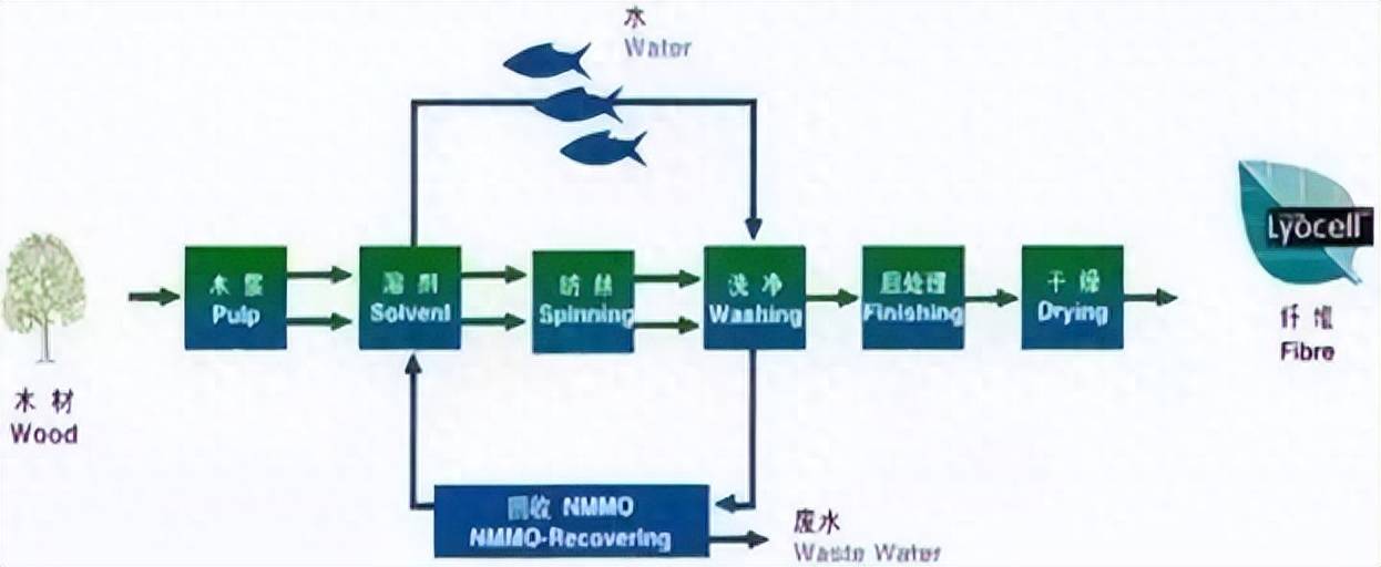 莱赛尔是以N-甲基氧化吗琳(NMMO)水溶液为溶剂,可以直接将纤维素浆粕溶解得到纺丝溶液,再采用湿法纺丝或干—湿法纺丝方法,以一定浓度的NMMO-
