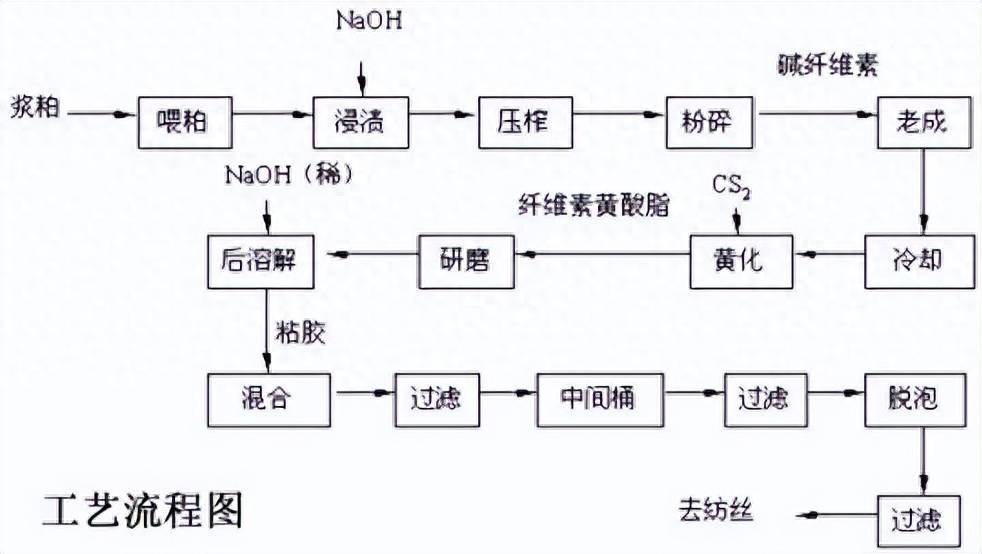 将植物纤维素经碱化而成碱纤维素,再与二硫化碳作用生成纤维素黄原酸酯, 溶解于稀碱液内得到的粘稠溶液称粘胶,粘胶经湿法纺丝和一系列处理工序后即成粘胶纤维。
