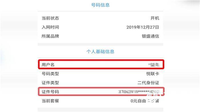 随后,记者用微信公众号“银盛业务网厅”激活了一张从商户处购买的电话卡,在电话卡的基本信息中可以看到,电话卡已经绑定了他人的用户名和身份证号,入网时间是2019年12月27日。