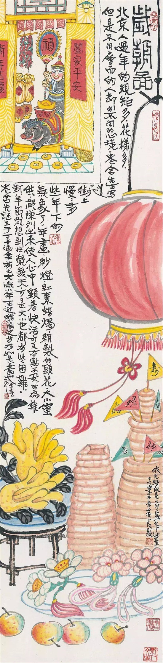 北京人过年的规矩多,花样多,但是不同层面的人却有不同的心境。老舍先生写道“街上慢慢有些年下的气象了。在晴明无风的时候,天气虽是干冷,可是路旁增多了颜色:年画,纱灯,红素蜡烛,绢制的头花,大小蜜供,都陈列出来,使人心中显着快活,可又有点不安;因为无论谁对年节都想到快乐几天,可是大小也都有些困难。”老舍先生诞生于120年前之犬岁小年正迎猪岁之首乃如是画也。