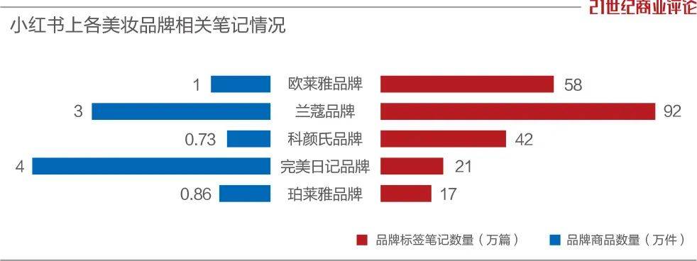 欧莱雅品牌标签的笔记,超过58万篇,商品超过1万;兰蔻品牌笔记,达到92万篇,商品超过3万件;科颜氏品牌笔记超过42万篇,商品超过7300件。