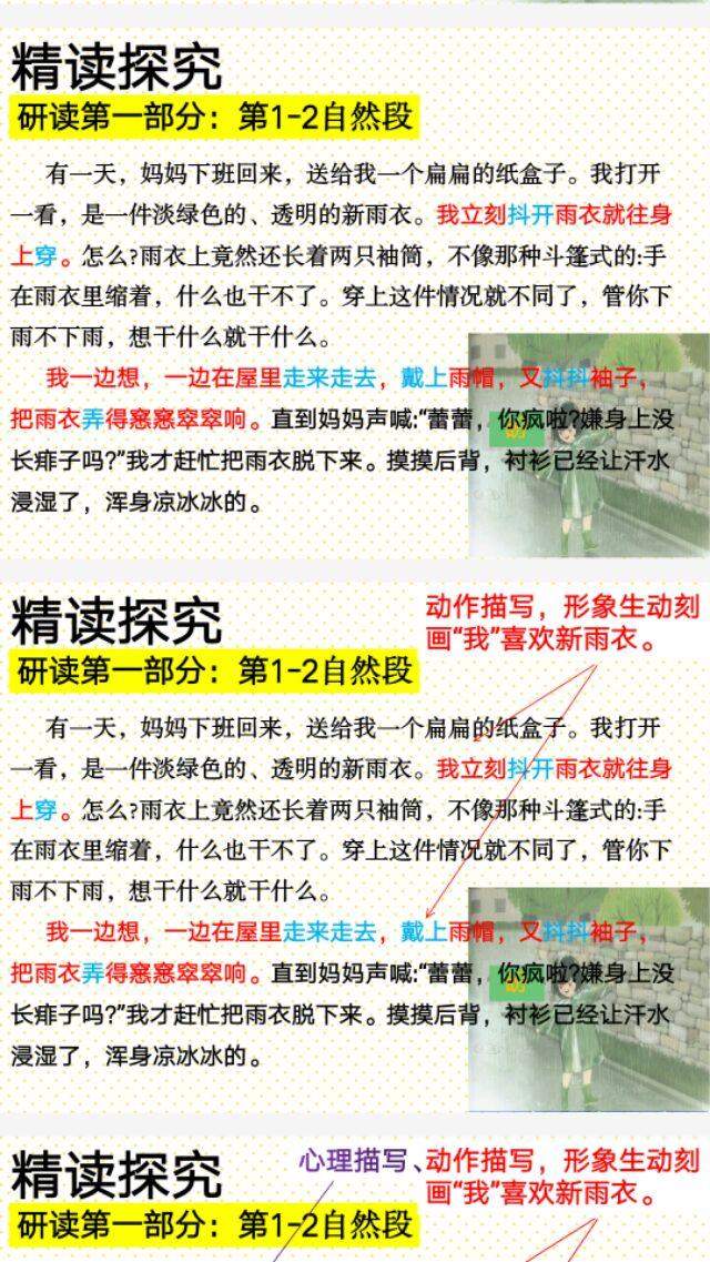 2.选文部分,作者的心情经历了哪些变化?担心(雨下完了)→欣慰(雨停了)→惊喜(第二天早晨下雨)→满足(穿上雨衣)。